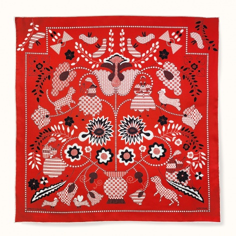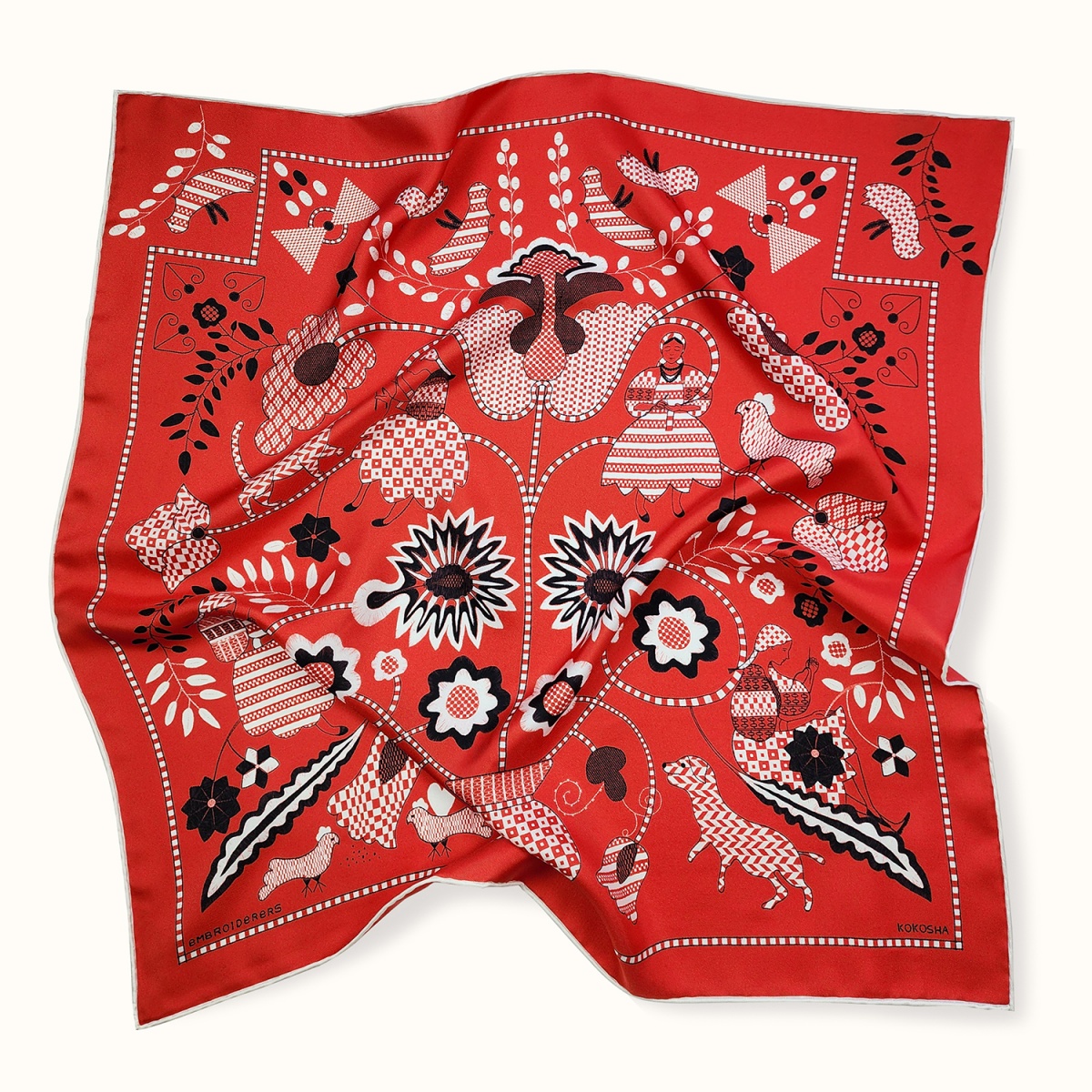 Платок "ВЫШИВАЛЬЩИЦЫ НА КРАСНОМ" шелк 65х65